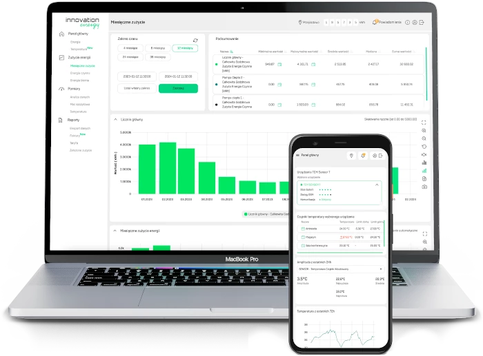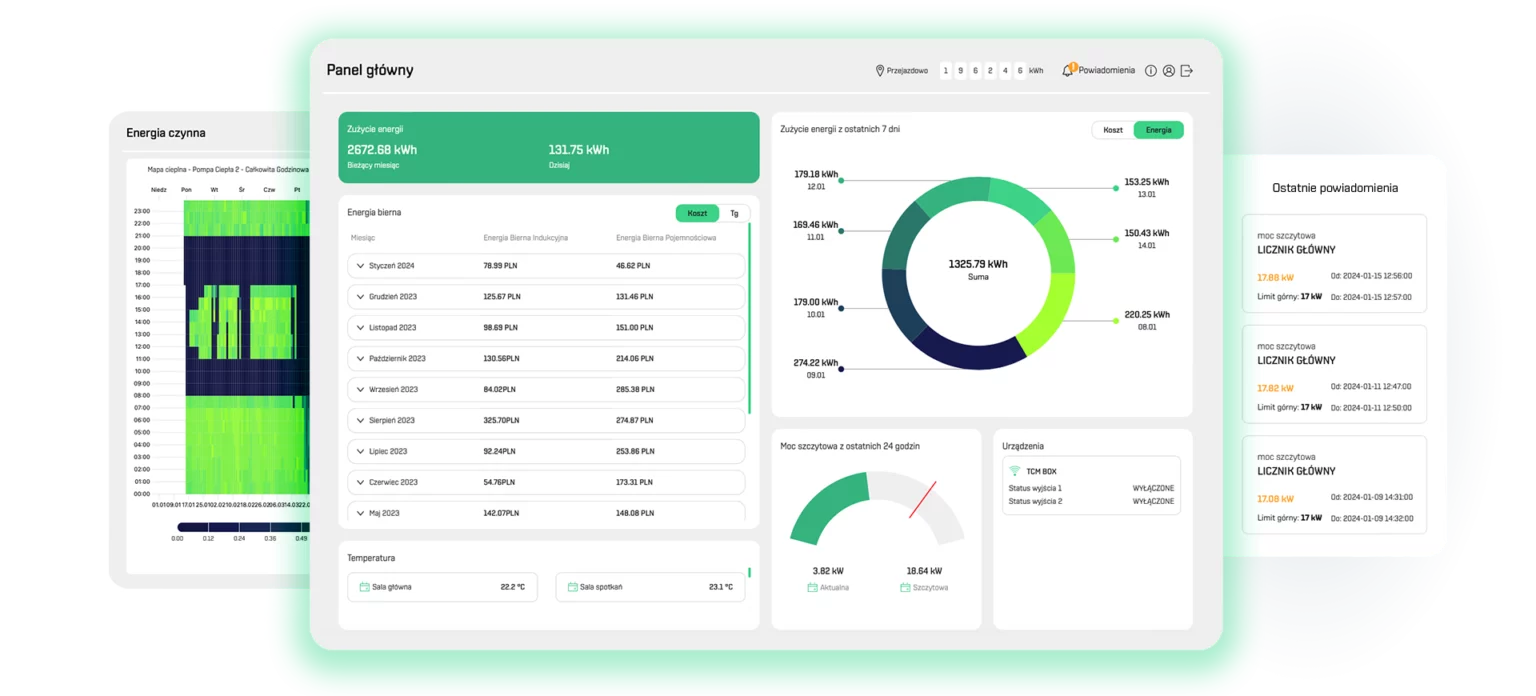 Zyskaj pełny obraz najważniejszych parametrów energetycznych Twojego obiektu. Dzięki intuicyjnemu zestawieniu kluczowych wskaźników, możesz łatwo monitorować zużycie energii, analizować trendy i natychmiast reagować na zmiany. To kompleksowe narzędzie do zarządzania efektywnością energetyczną.